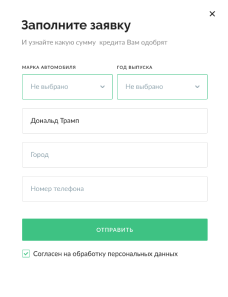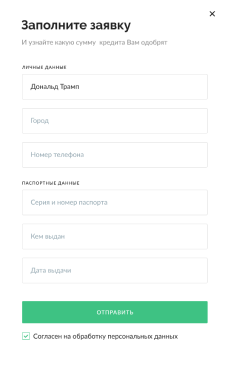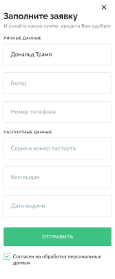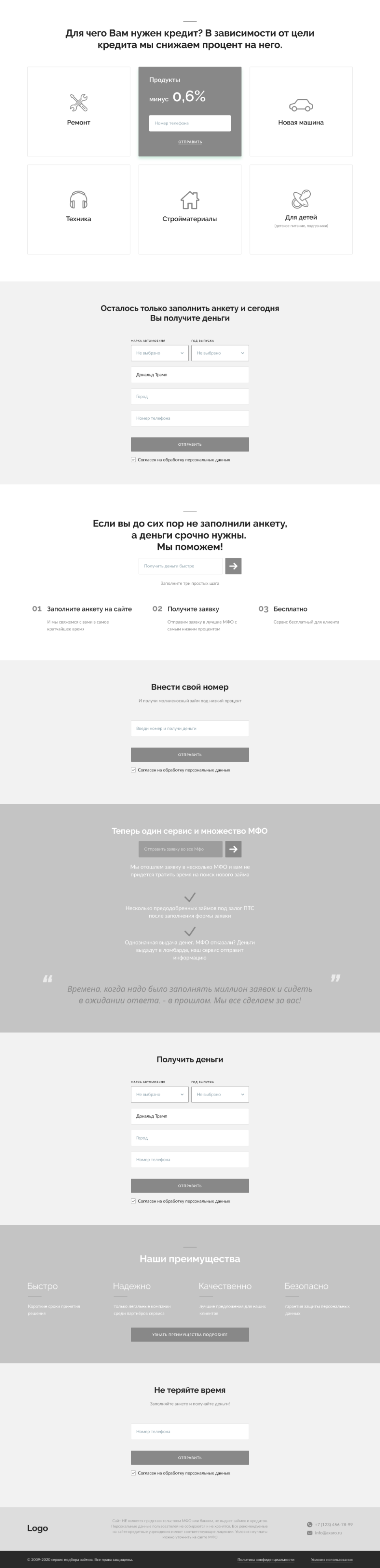 На первом экране интерфейс выбора займа и отправки данных. Далее преимущества сервиса. Пожелание клиента было разместить большое кол-во форм захвата...