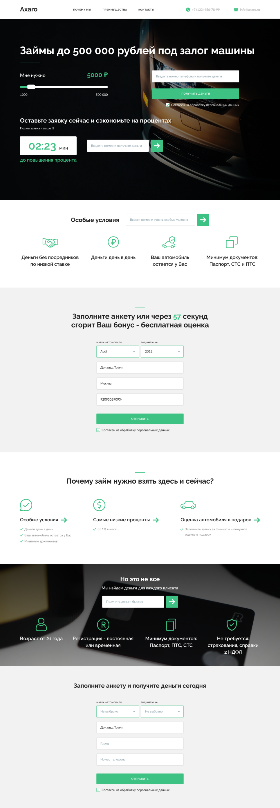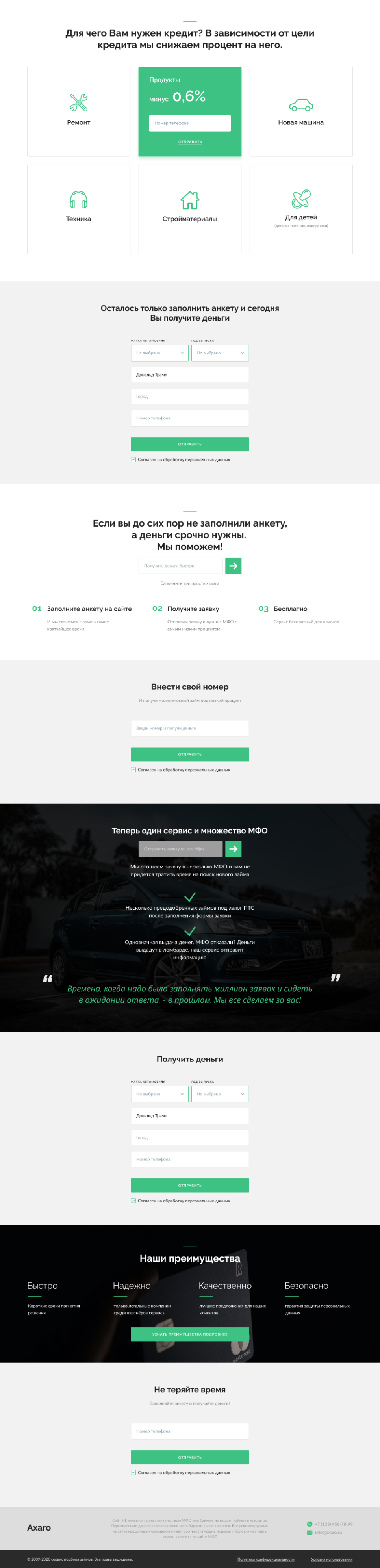 Axaro — сервис, который предоставляет своим клиентам быстрые займы под залог автомобилей. Был разработан адаптивный дизайн лендинга с легким дизайном и простым интерфейсом.