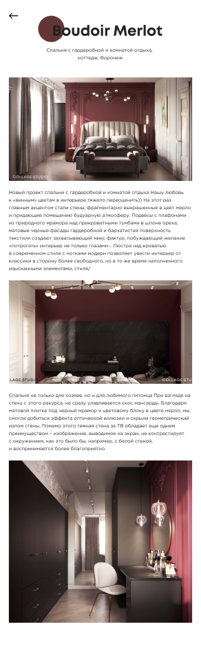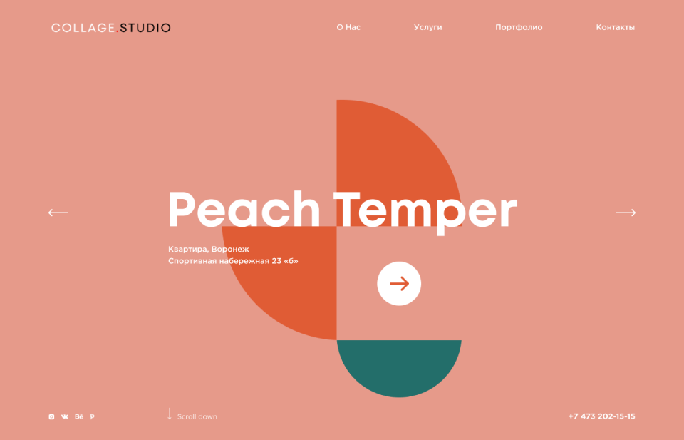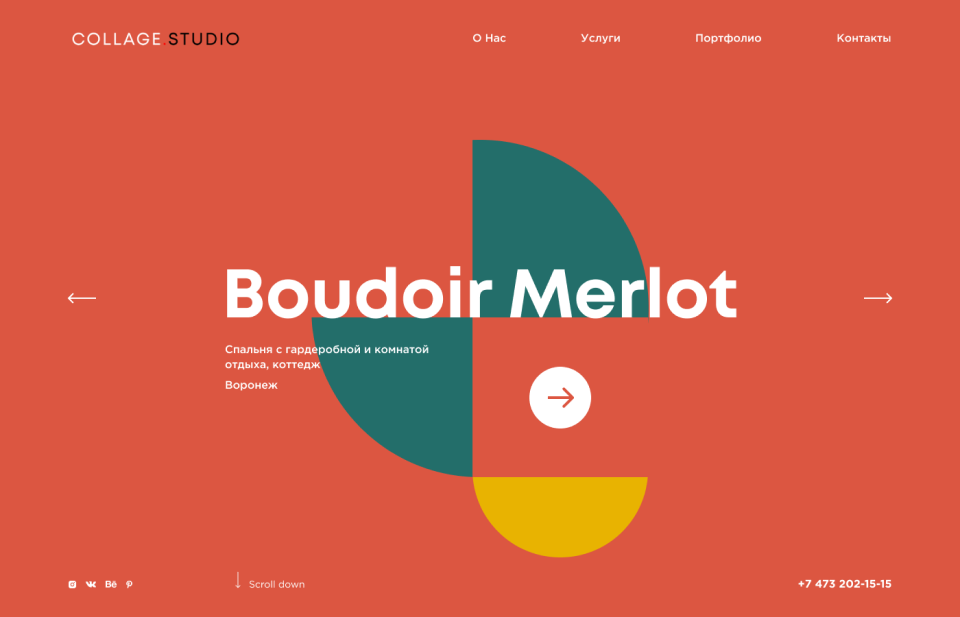 ...цвета беруться из интерьера конкретного проекта. При наведении на стрелку появляется фото работы. Можно перейти внутрь кейса и листать работы.